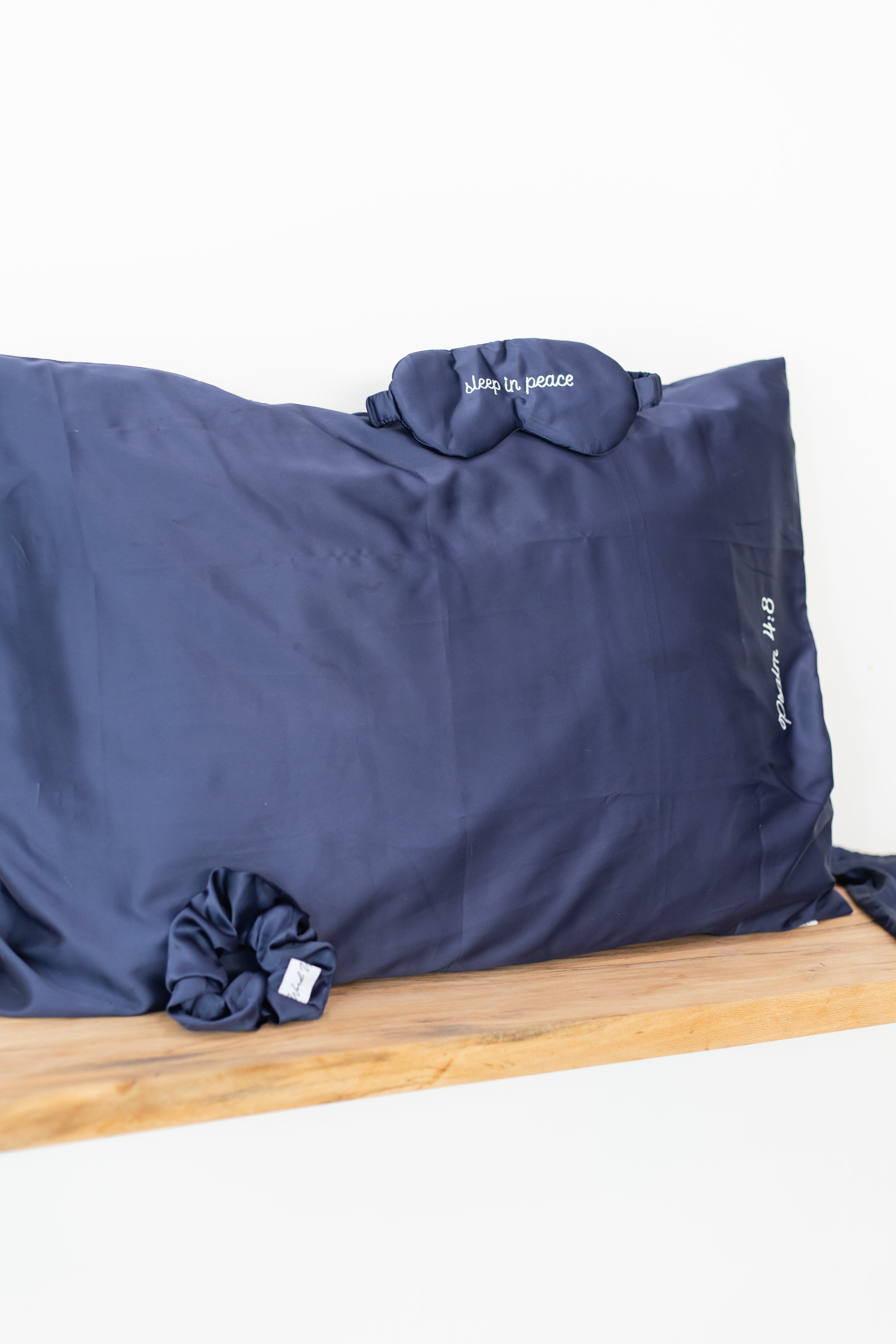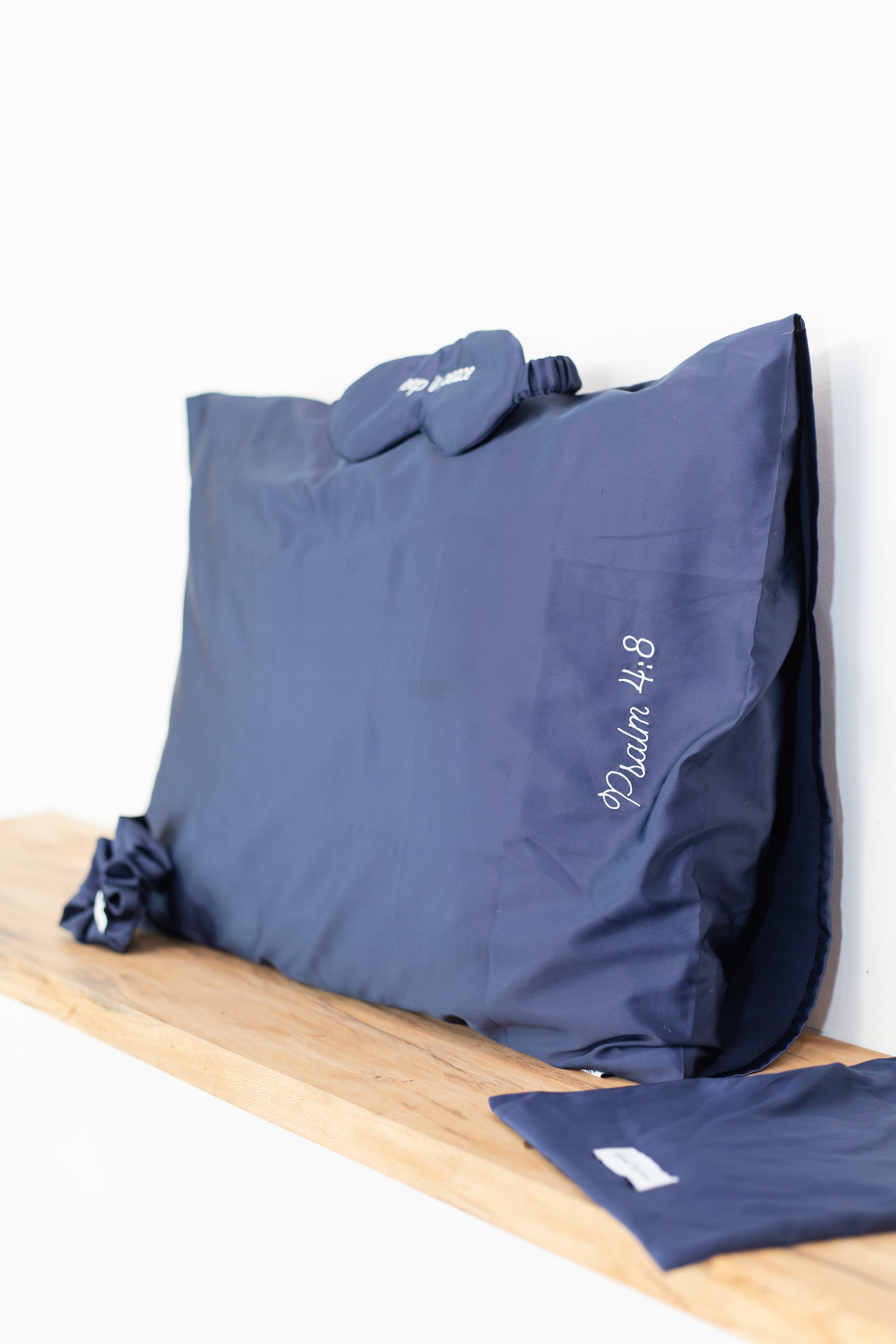 Satin Pillowcase Gift Set with Satin Sleep Mask & Scrunchie: Embroidered “Sleep in Peace” + Psalm 4:8 | Word Warriors