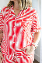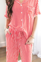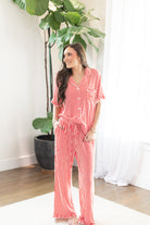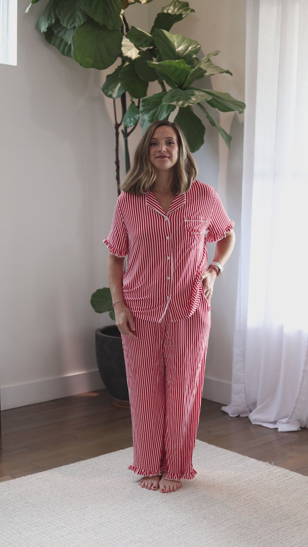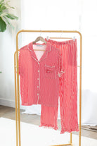 Made for Christmas mornings, cozy nights, and sweet family traditions, this red stripe pajama set is a festive favorite she’ll love. Crafted in a soft bamboo blend with “Rejoice” embroidered on the pocket, these pajamas are a joyful reminder of faith and comfort during the holiday season.