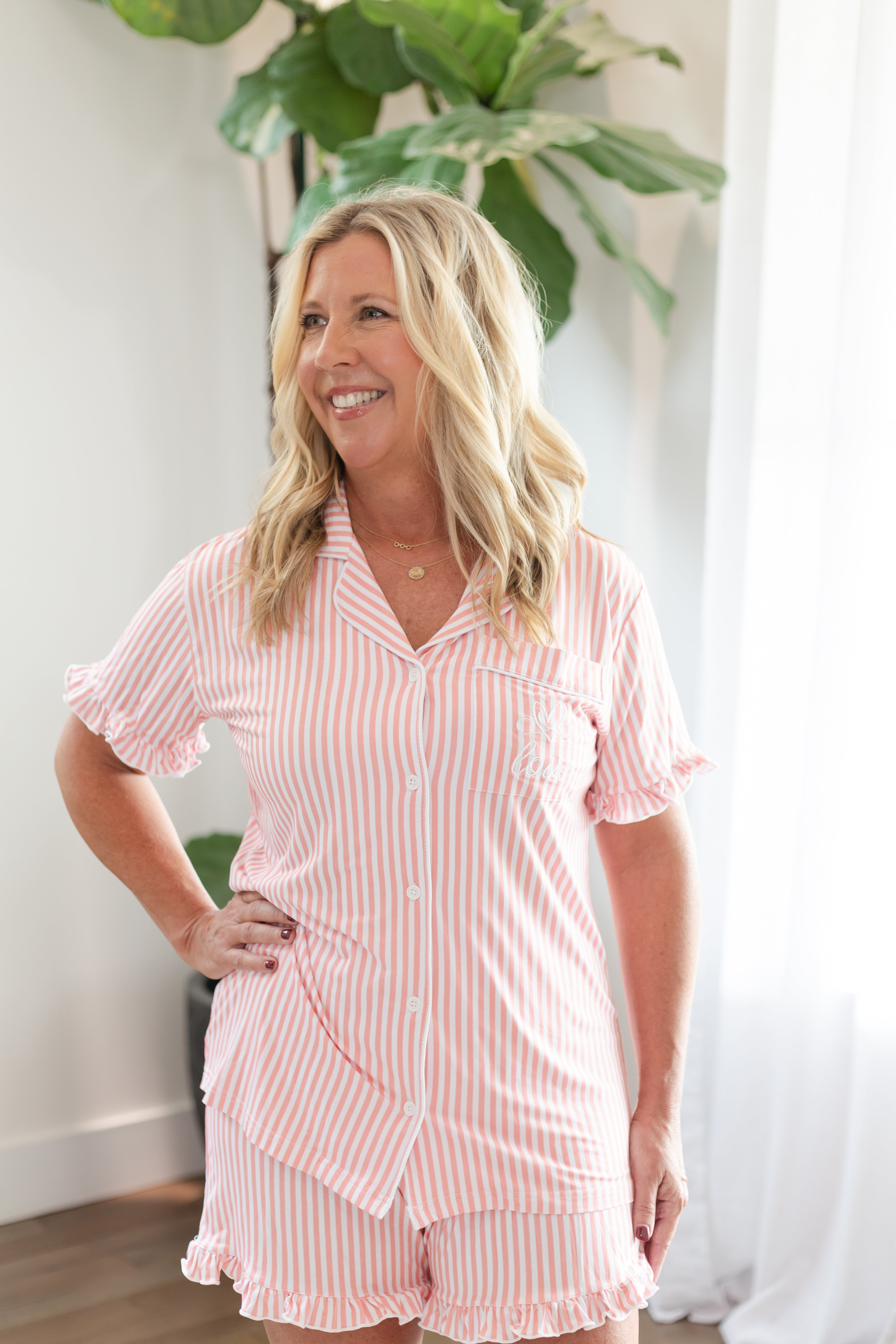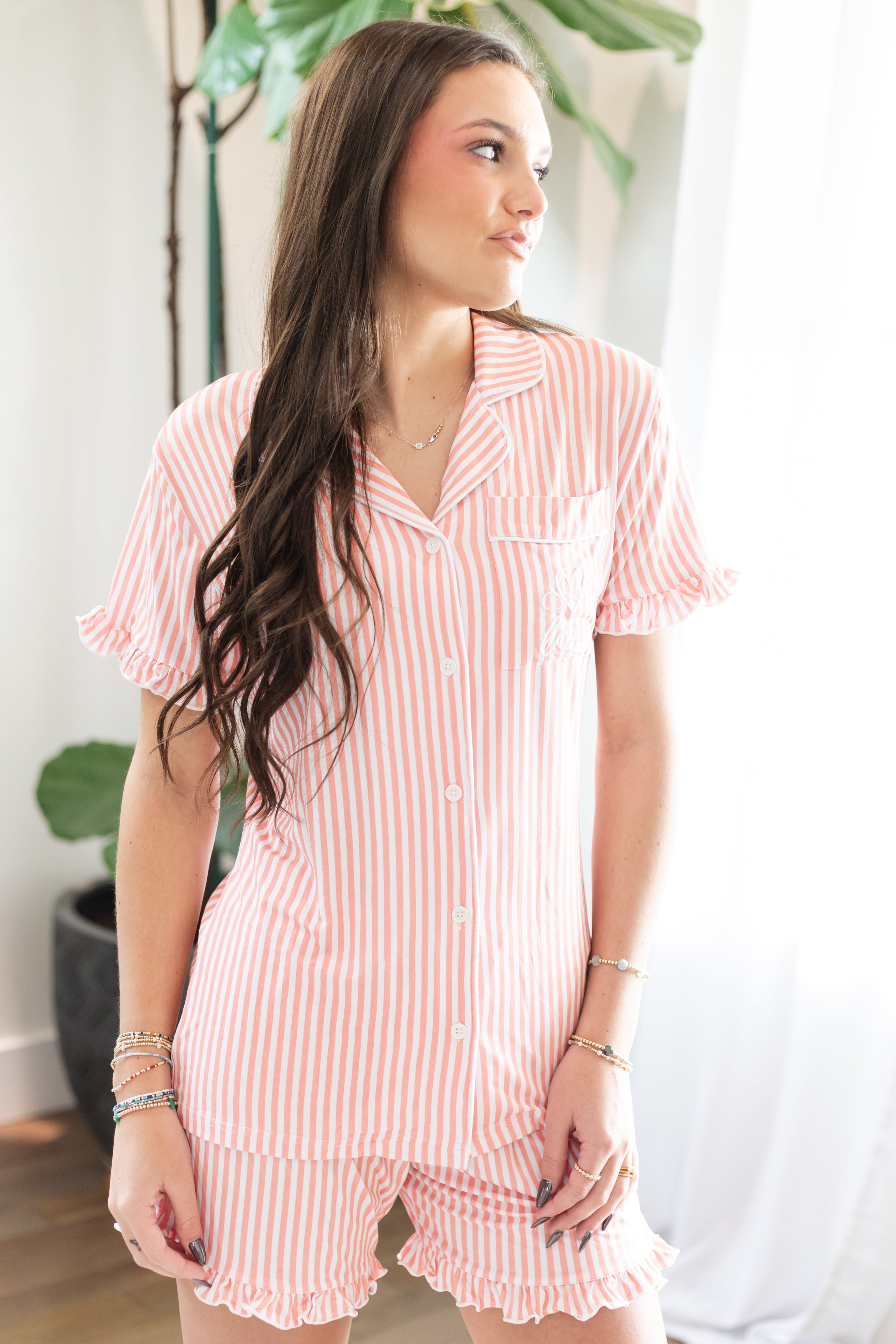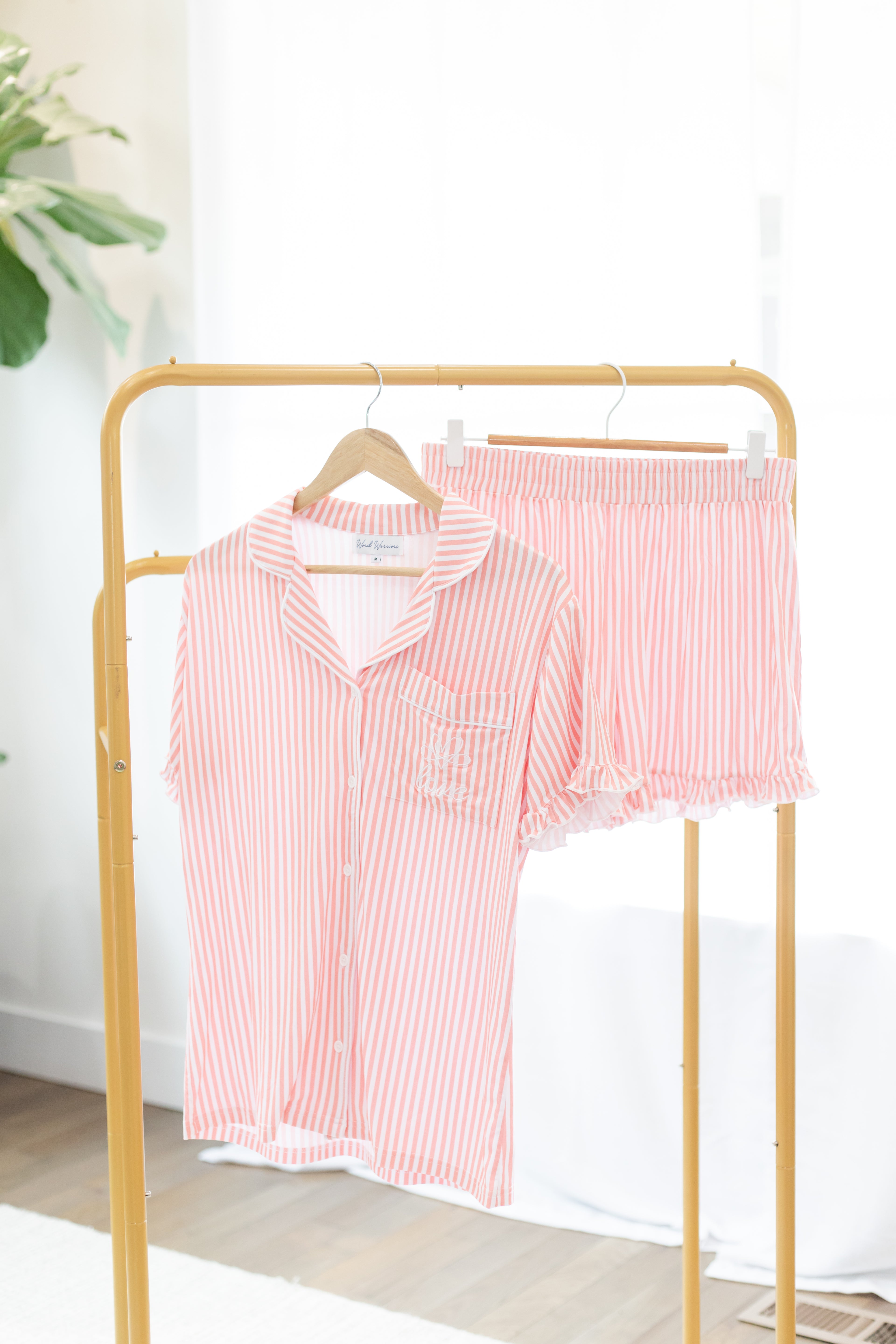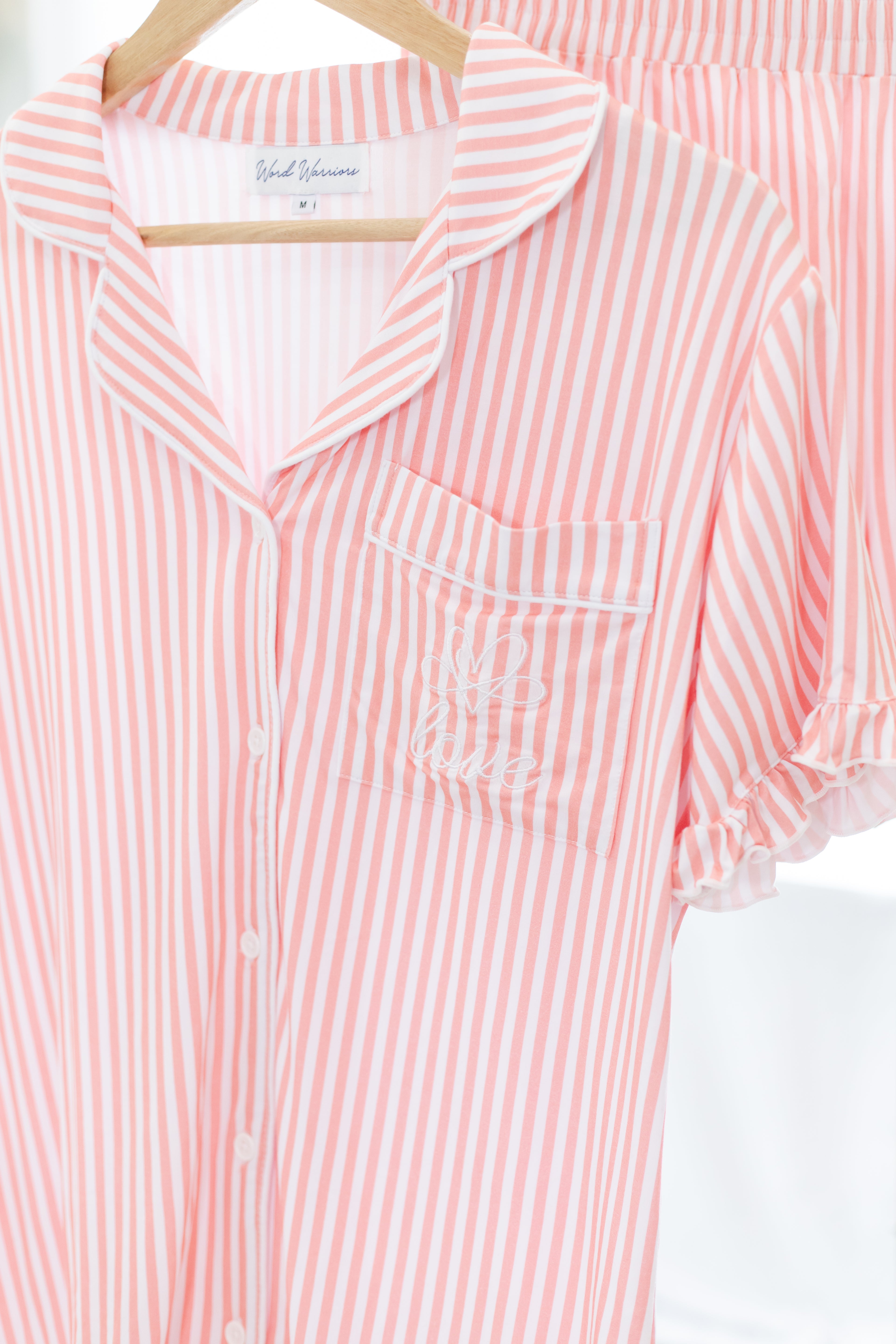 The button-up short-sleeve top pairs perfectly with matching ruffle shorts, both detailed with classic pink and white stripes. A delicate “love” embroidery graces the pocket, offering a subtle faith-inspired touch that reminds you of what truly matters.
