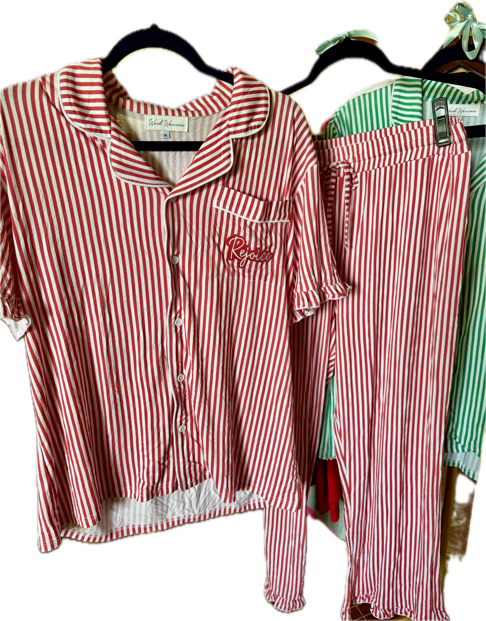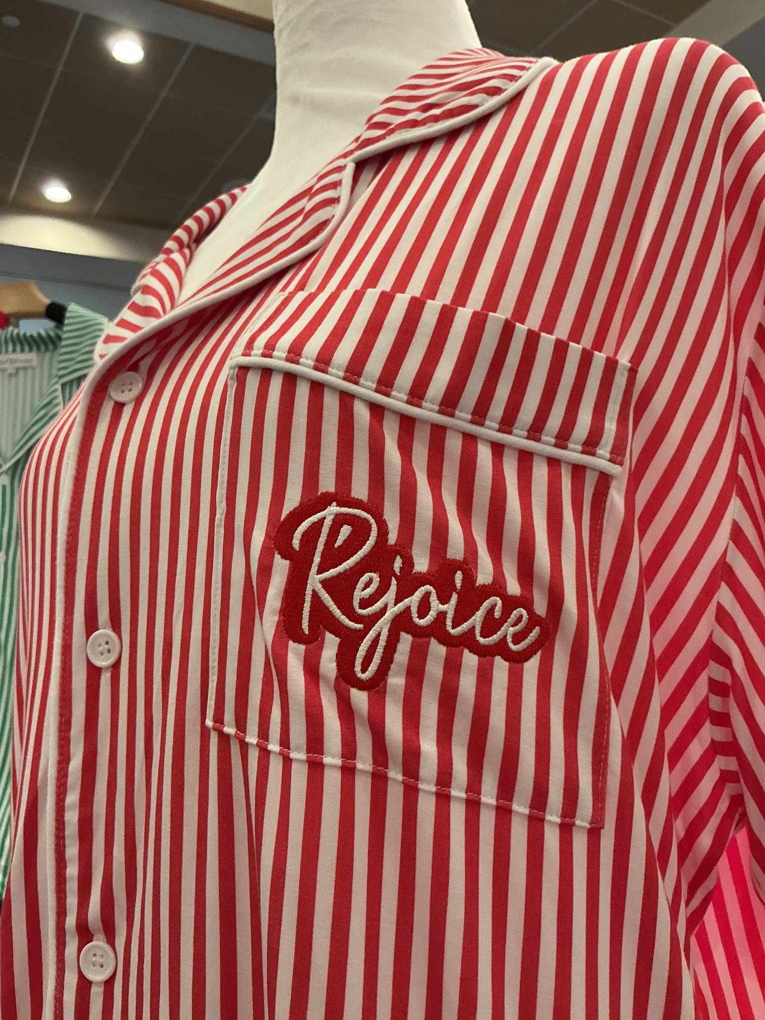 Made for Christmas mornings, cozy nights, and sweet family traditions, this red stripe pajama set is a festive favorite she’ll love. Crafted in a soft bamboo blend with “Rejoice” embroidered on the pocket, these pajamas are a joyful reminder of faith and comfort during the holiday season.