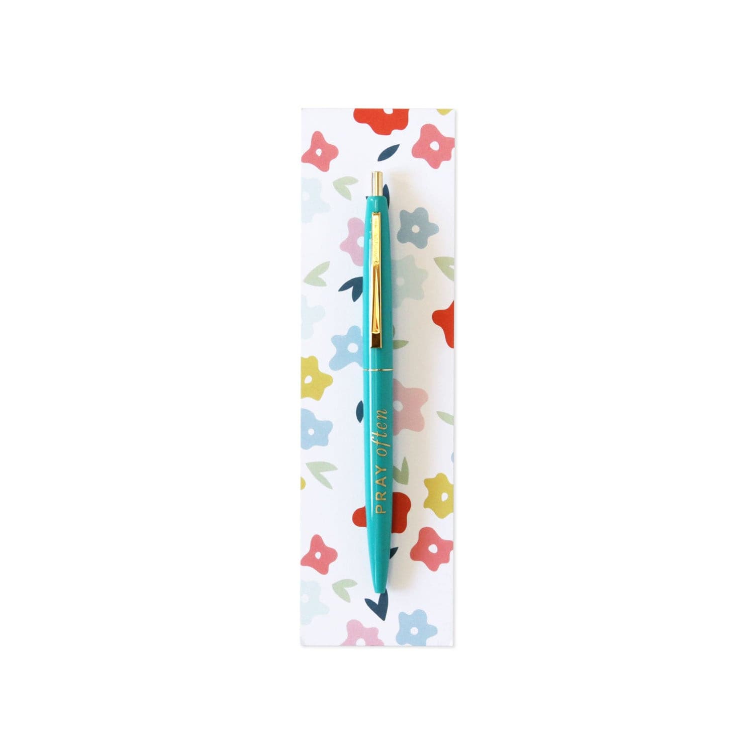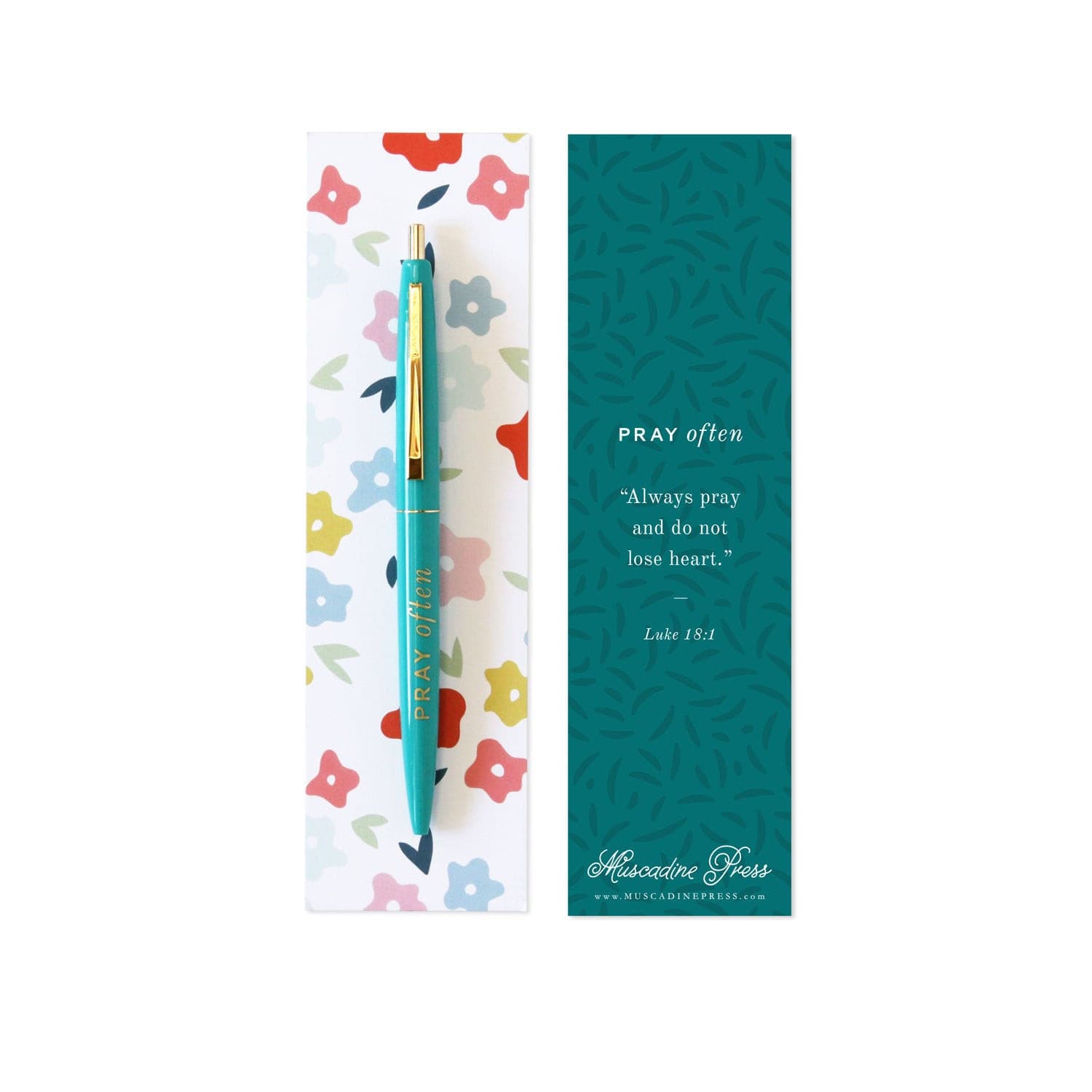 Pray Often. Our classic ballpoint pens are designed to be sweet reminders of truth in the middle of busy days. This simple white pen features gold details and a rainbow stripe backer that doubles as a Bible verse bookmark, making it the perfect little gift or happy for the ones who mean the most.