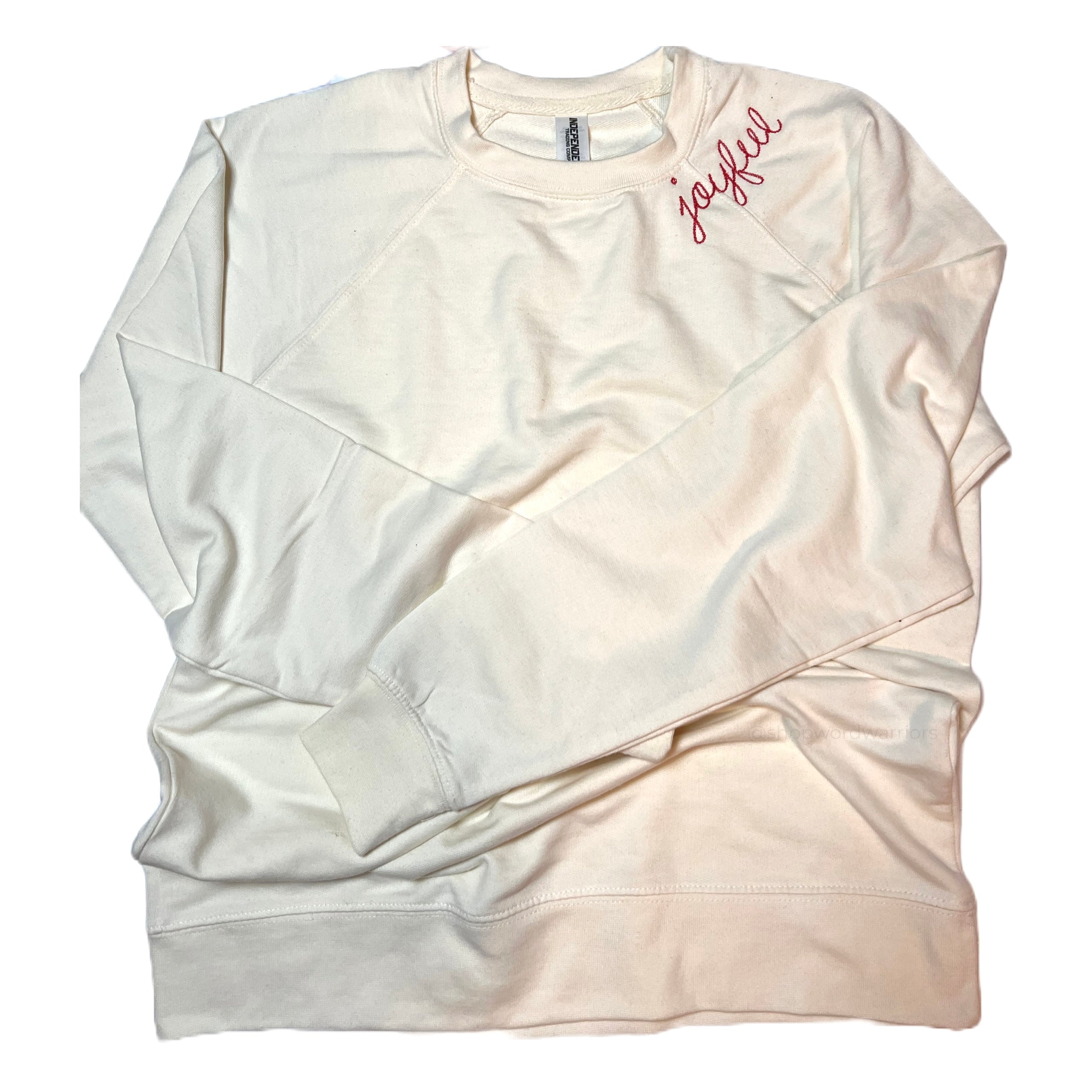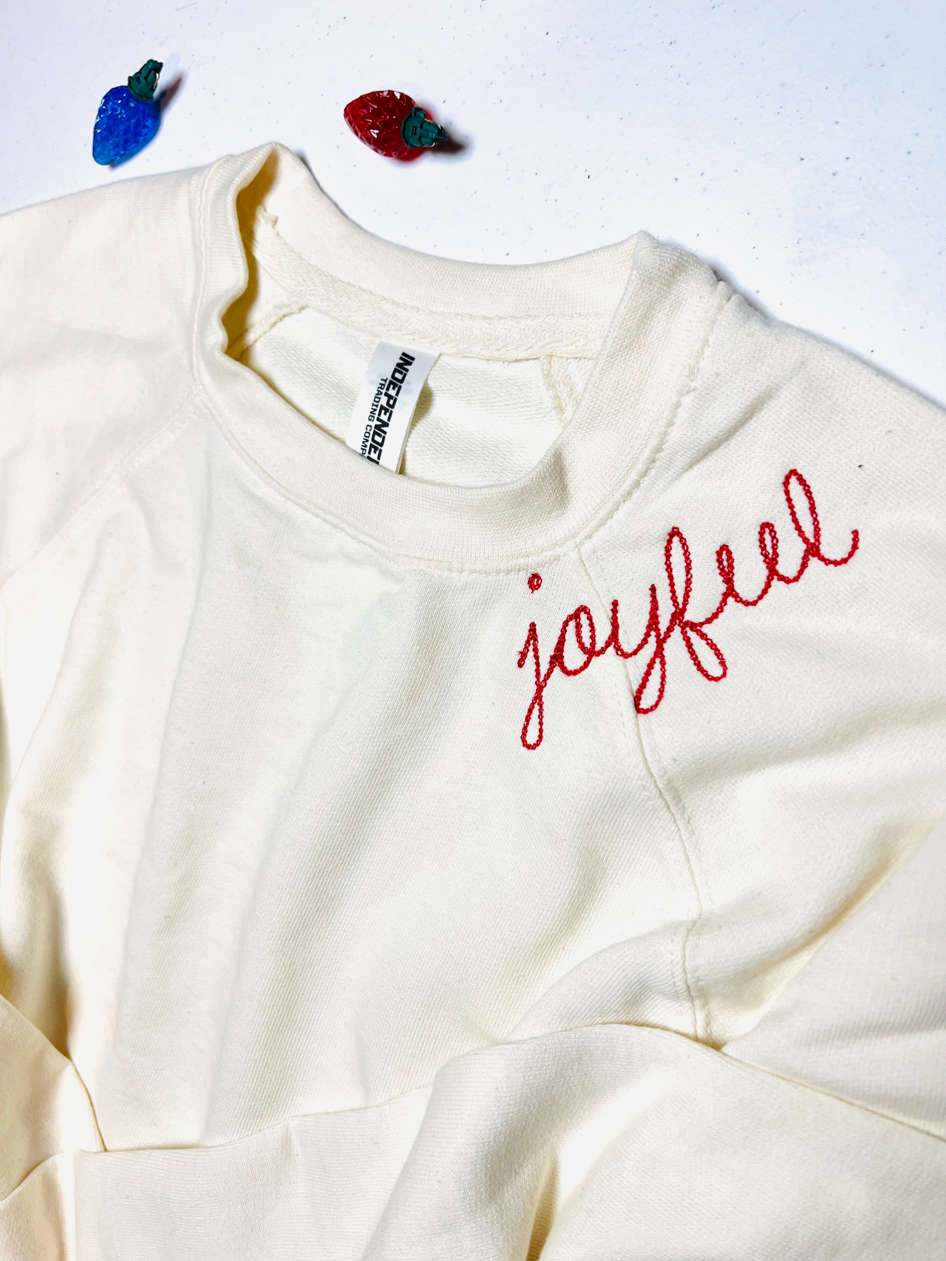 Our “joyful” embroidered crewneck sweatshirt is so unique and so perfect for the Christmas season. The sweatshirt is a ivory/bone color with a red thread.
