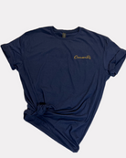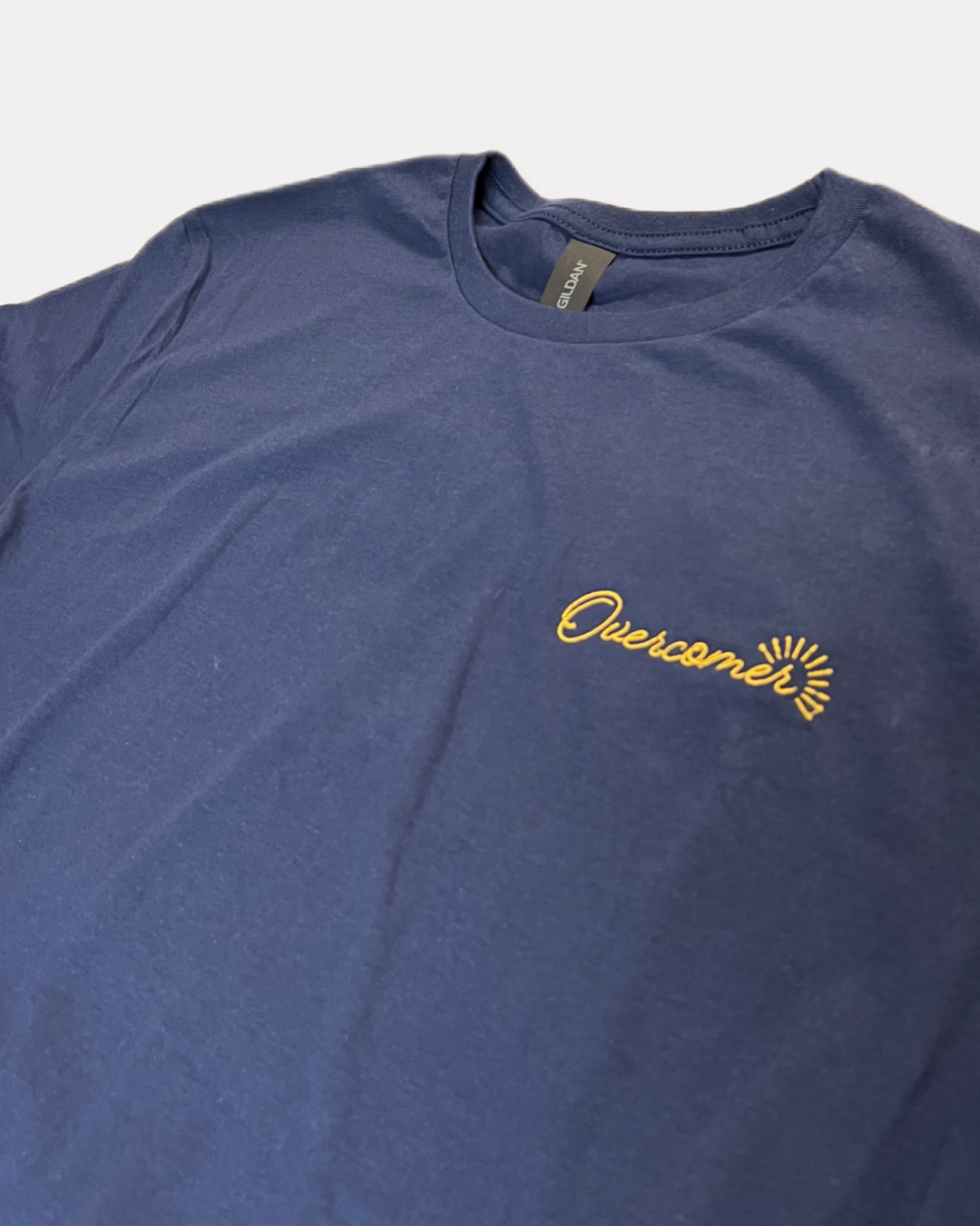 Overcomer T-Shirt, Navy with Elegant Gold Embroidery - Faith-Inspired Apparel, Cancer Warrior