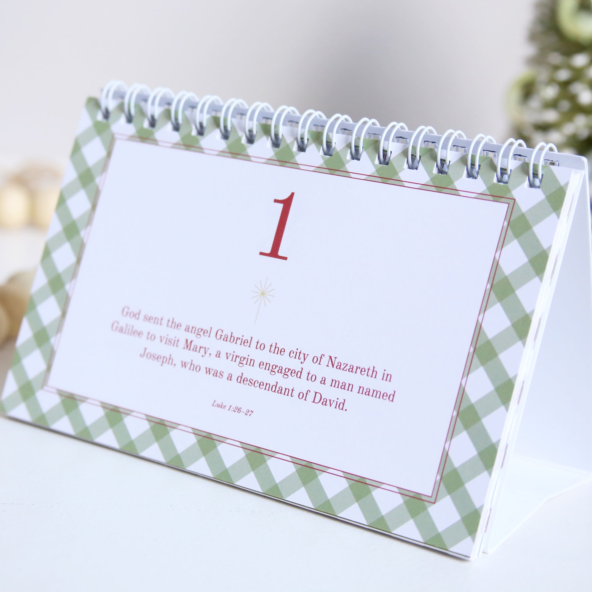 This simple tabletop Advent calendar features 25 days of scripture to focus your heart and mind on gospel truth during the Christmas season. Each daily page includes a short Bible passage and festive holiday patterns to help you create a cherished Christmas tradition in your home.